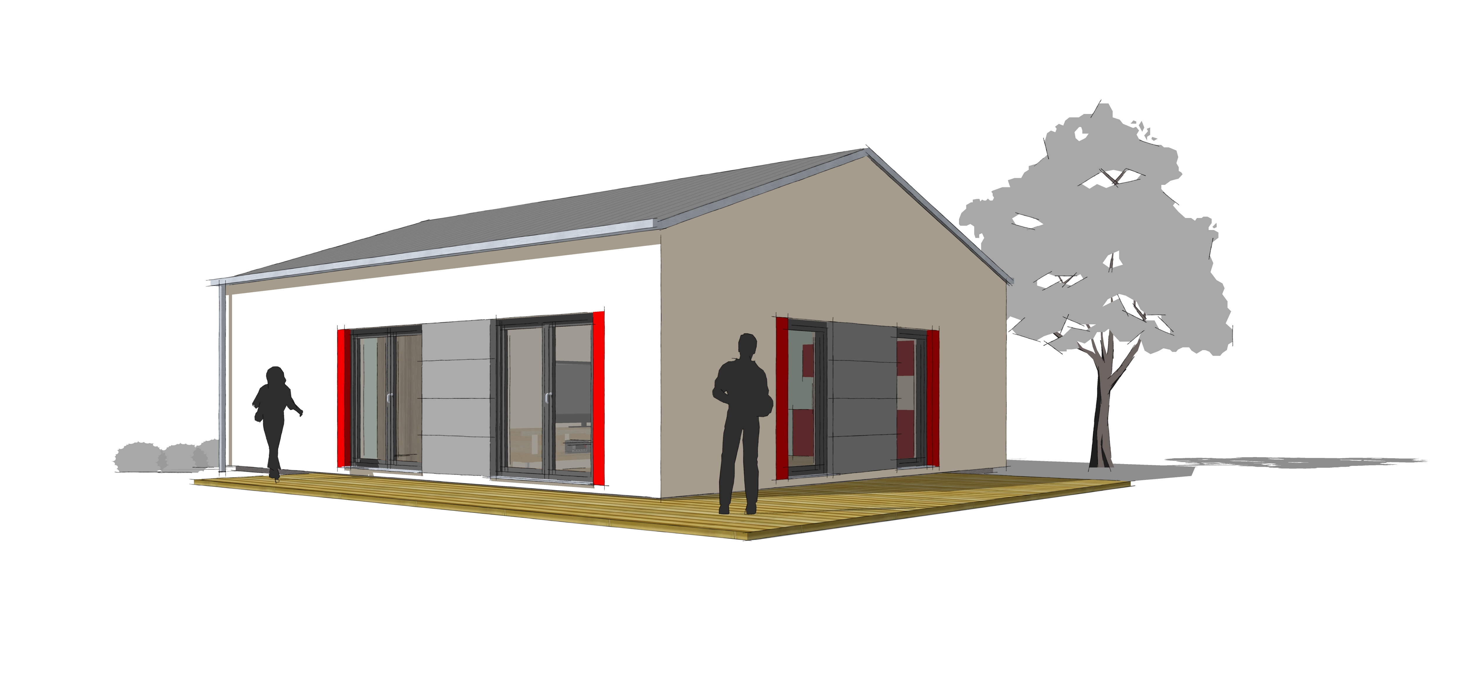 Moderní dům typu bungalov se sedlovou střechou o dispozici 3+kk je vhodný pro 3 osoby. Hodí se na rovinatý pozemek do nové i stávající jednopodlažní zástavby. Centrem domu je velký obývací pokoj s kuchyňským koutem a jídelnou s přímým vstupem na terasu. Na fasádu jsou použity fasádní desky v kombinaci s minerální omítkou, tato kombinace dává domu velmi svěží a moderní vzhled.